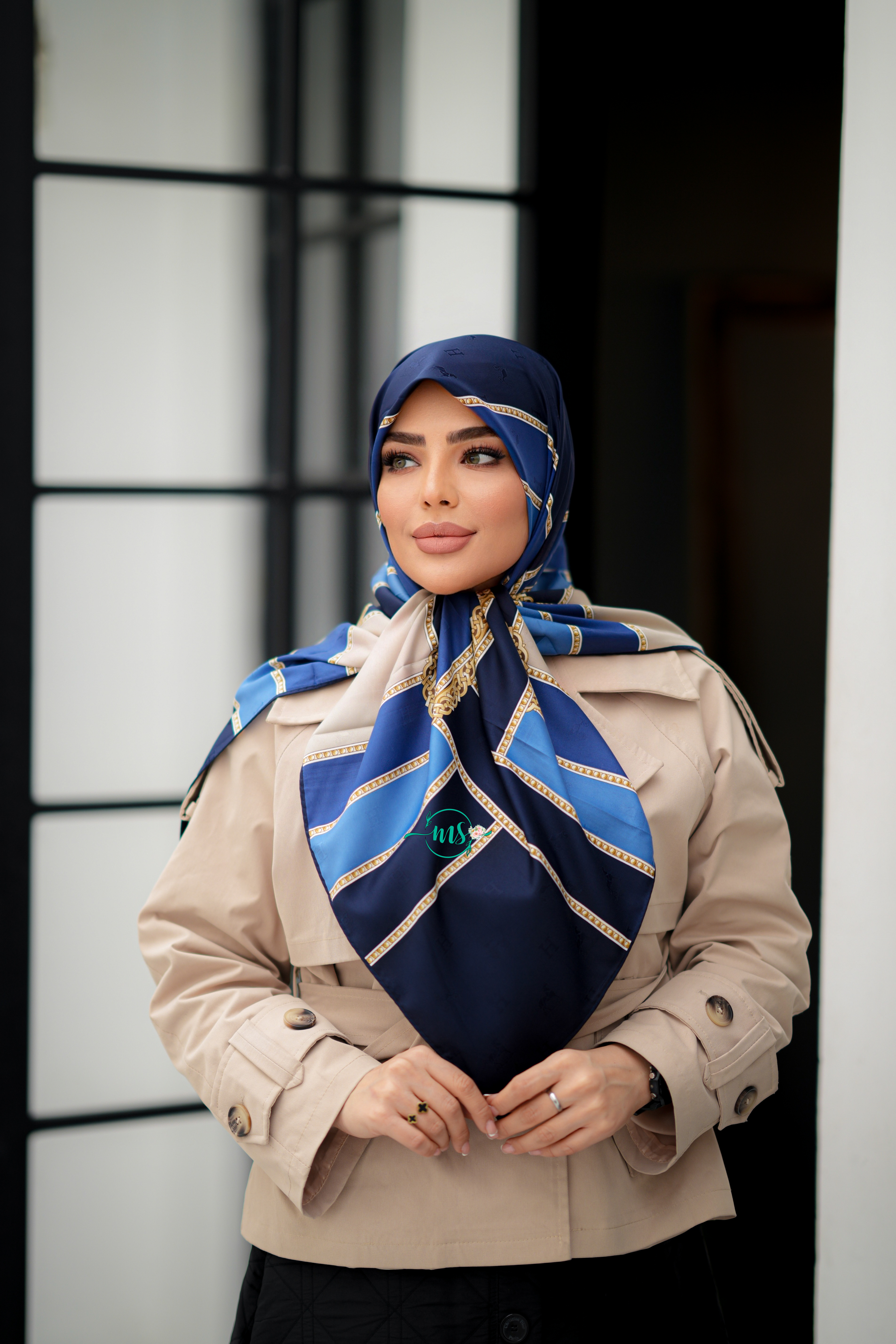 روسری ابریشم ژاکارد طرح کمربندی وسط ساده سرمه ای آبی