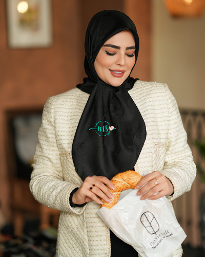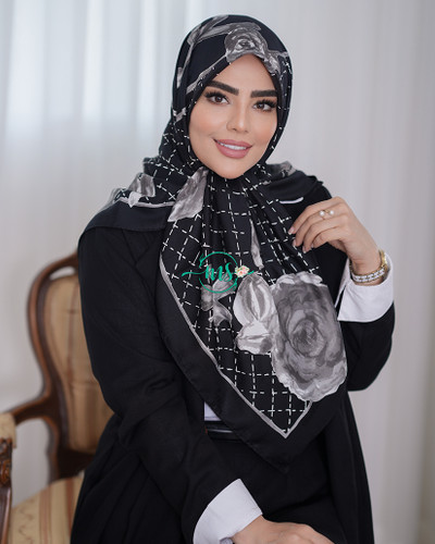 روسری نخ ابریشم ژاکارد طرح شنل مشکی نقره ای