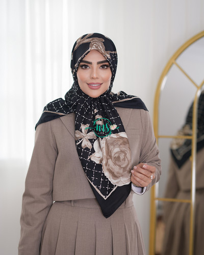 روسری ابریشم ژاکارد طرح شنل مشکی کرم تیره