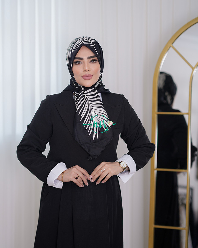 روسری ابریشم ژاکارد طرح برگ مشکی سفید