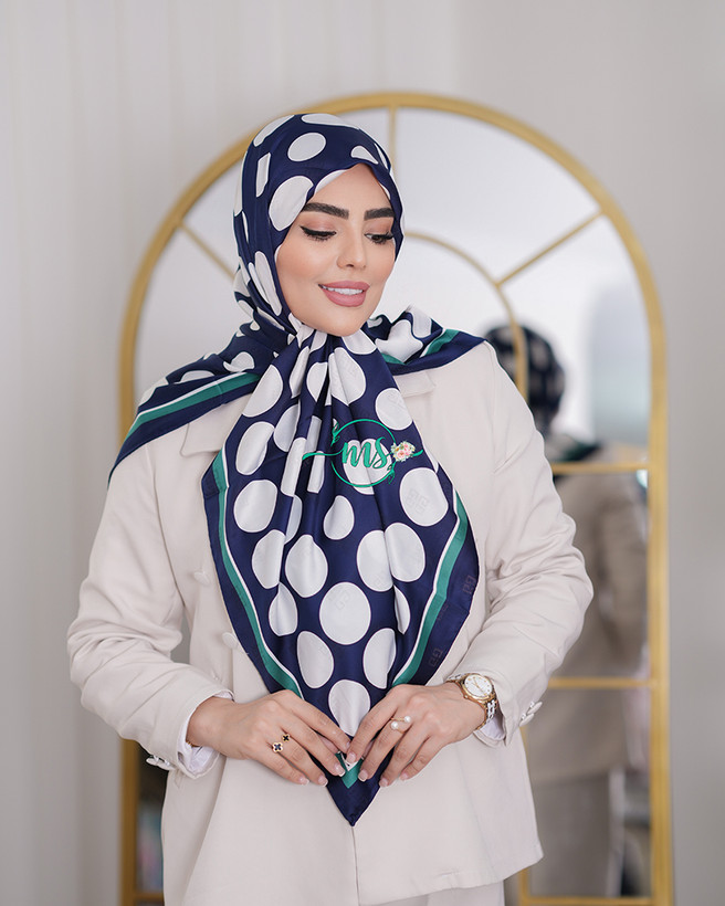روسری ابریشم ژاکارد طرح خال خالی سرمه ای