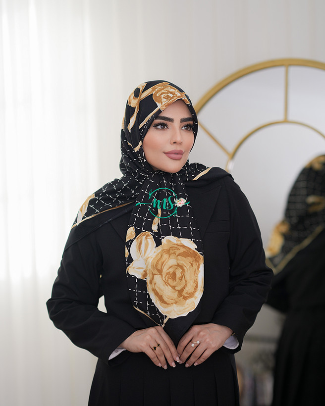 روسری ابریشم ژاکارد طرح گل شنل مشکی طلایی