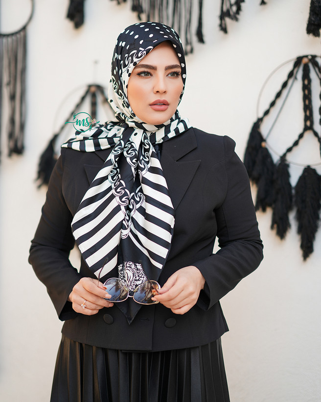 روسری ابریشم ژاکارد طرح خال خالی مشکی سفید