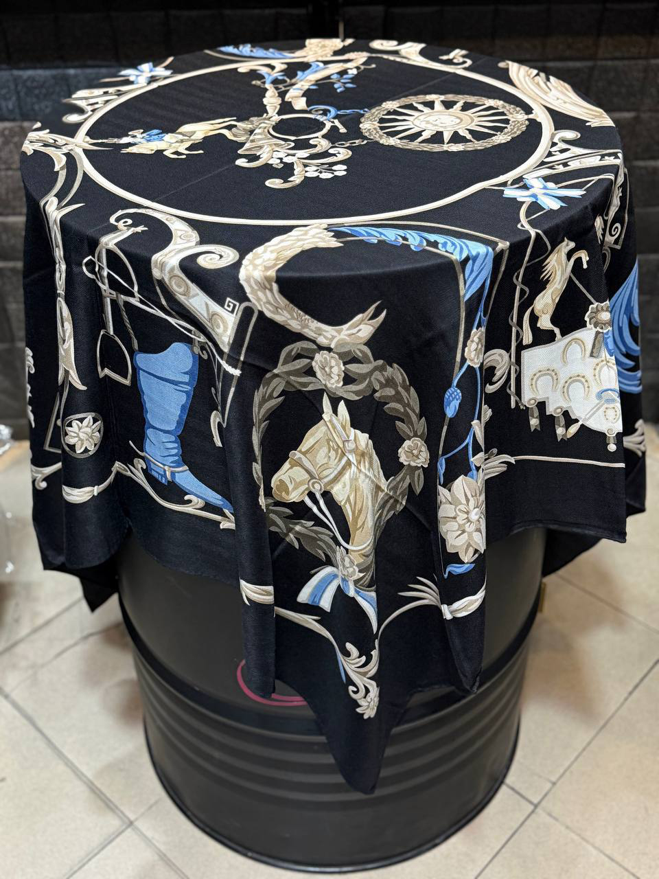 روسری کشمیر طرح هرمس اسب و حلقه رنگ کرم آبی
