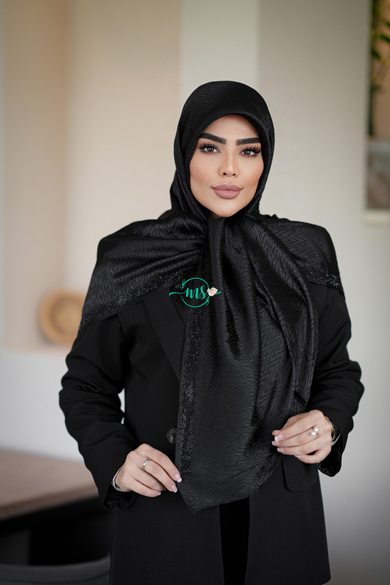 روسری ابریشم ژاکارد طرح جناقی نگین دار مشکی