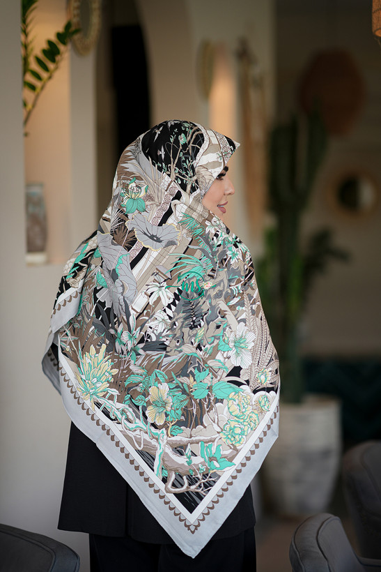روسری کشمیر طرح بهشت رنگ طوسی کرم شکلاتی