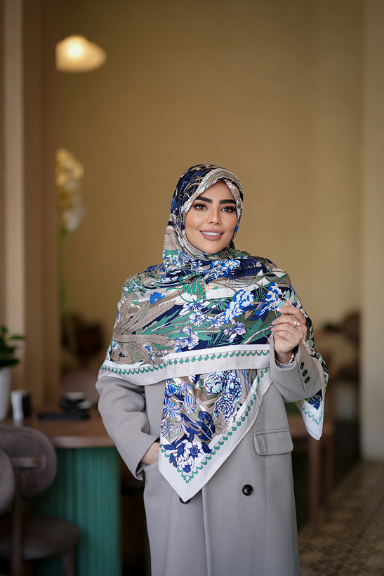 روسری کشمیر طرح بهشت رنگ طوسی کرم سرمه ای