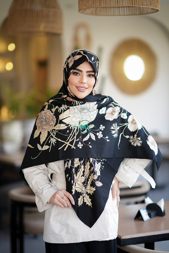 روسری کشمیر طرح گل دلبر گوچی رنگ مشکی کرم