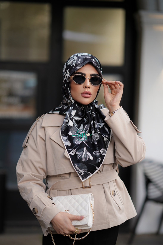 روسری ابریشم طرح گل جیوانجی رنگ مشکی سفید