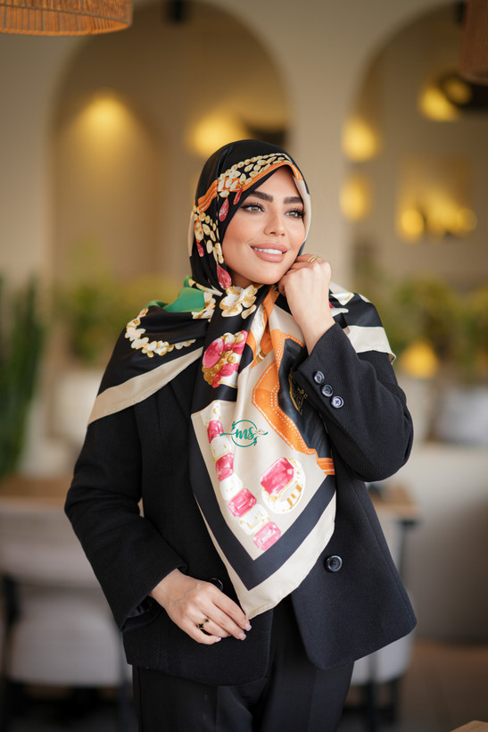 روسری ابریشم کجراه طرح کارتیه مشکی کرم نارنجی