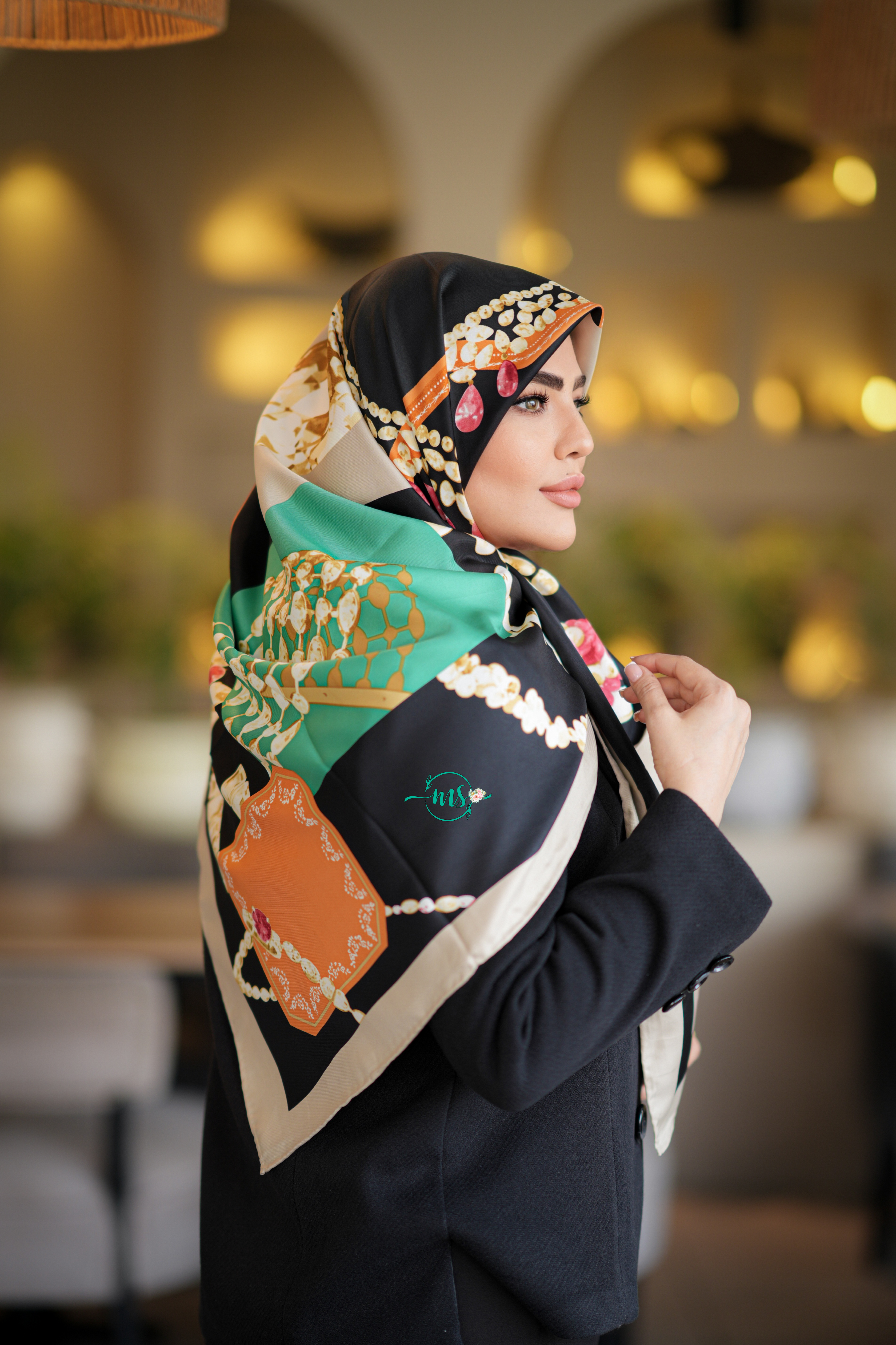 روسری ابریشم کجراه طرح کارتیه مشکی کرم نارنجی