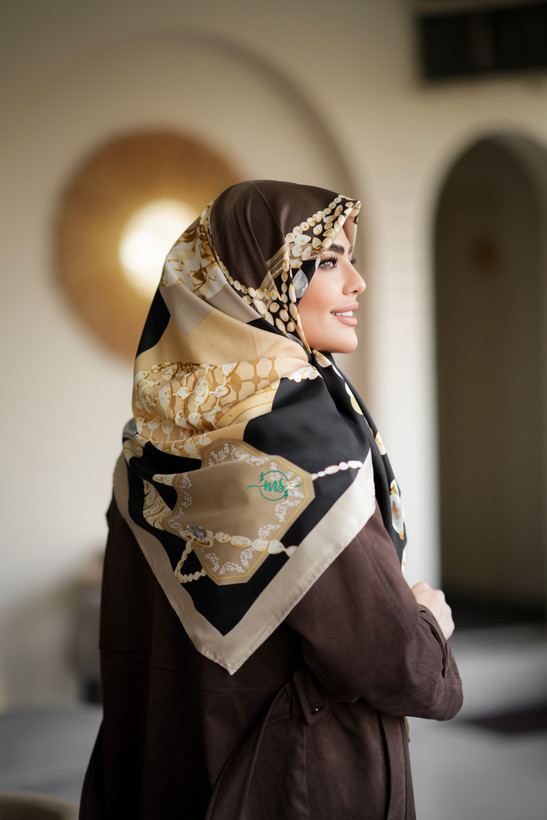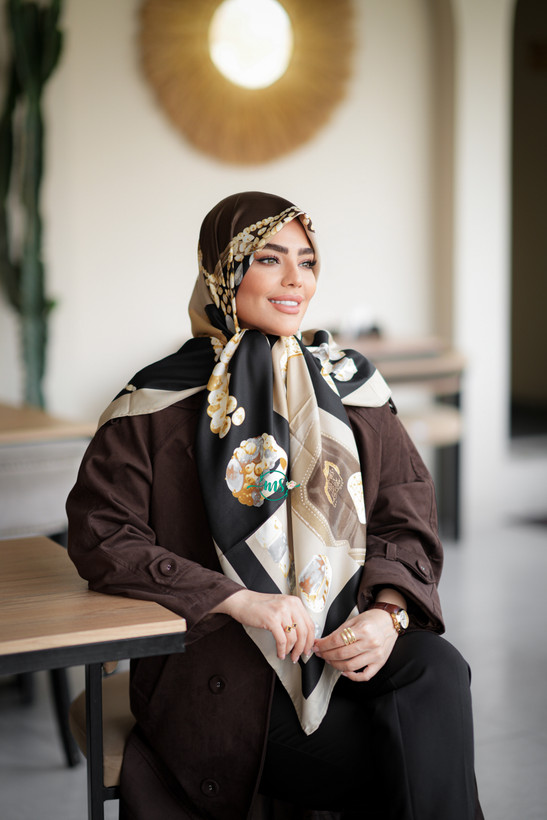 روسری ابریشم کجراه طرح کارتیه مشکی کرم