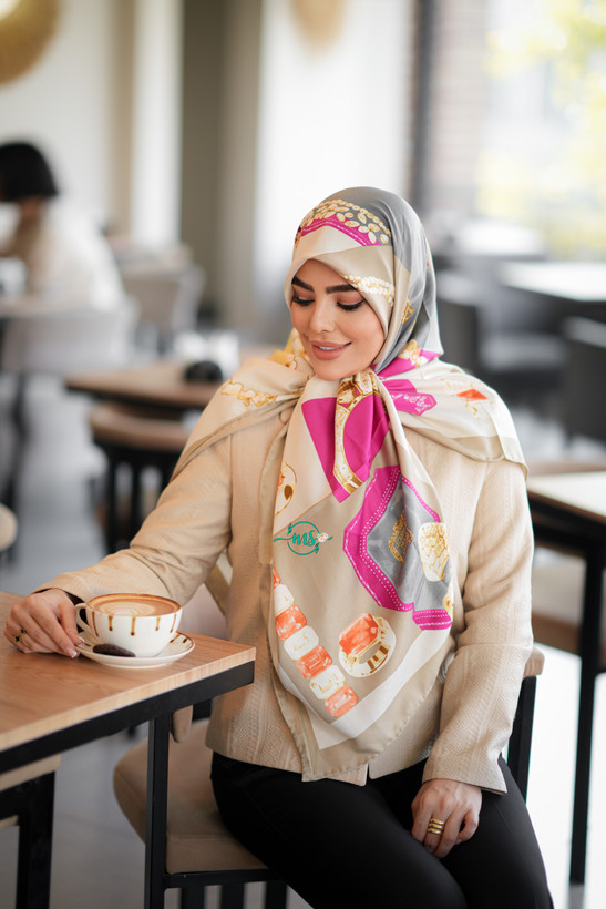 روسری ابریشم کجراه طرح کارتیه کرم سرخابی