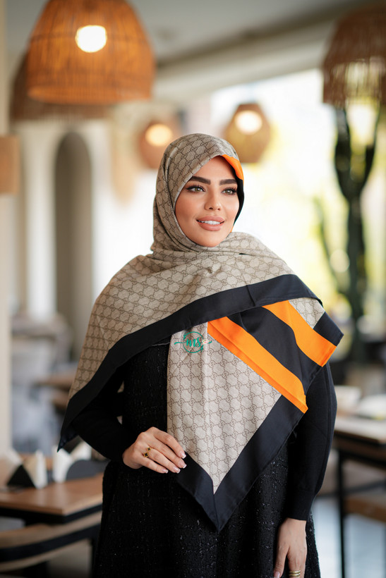 روسری ابریشم کجراه طرح گوچی مشکی نارنجی