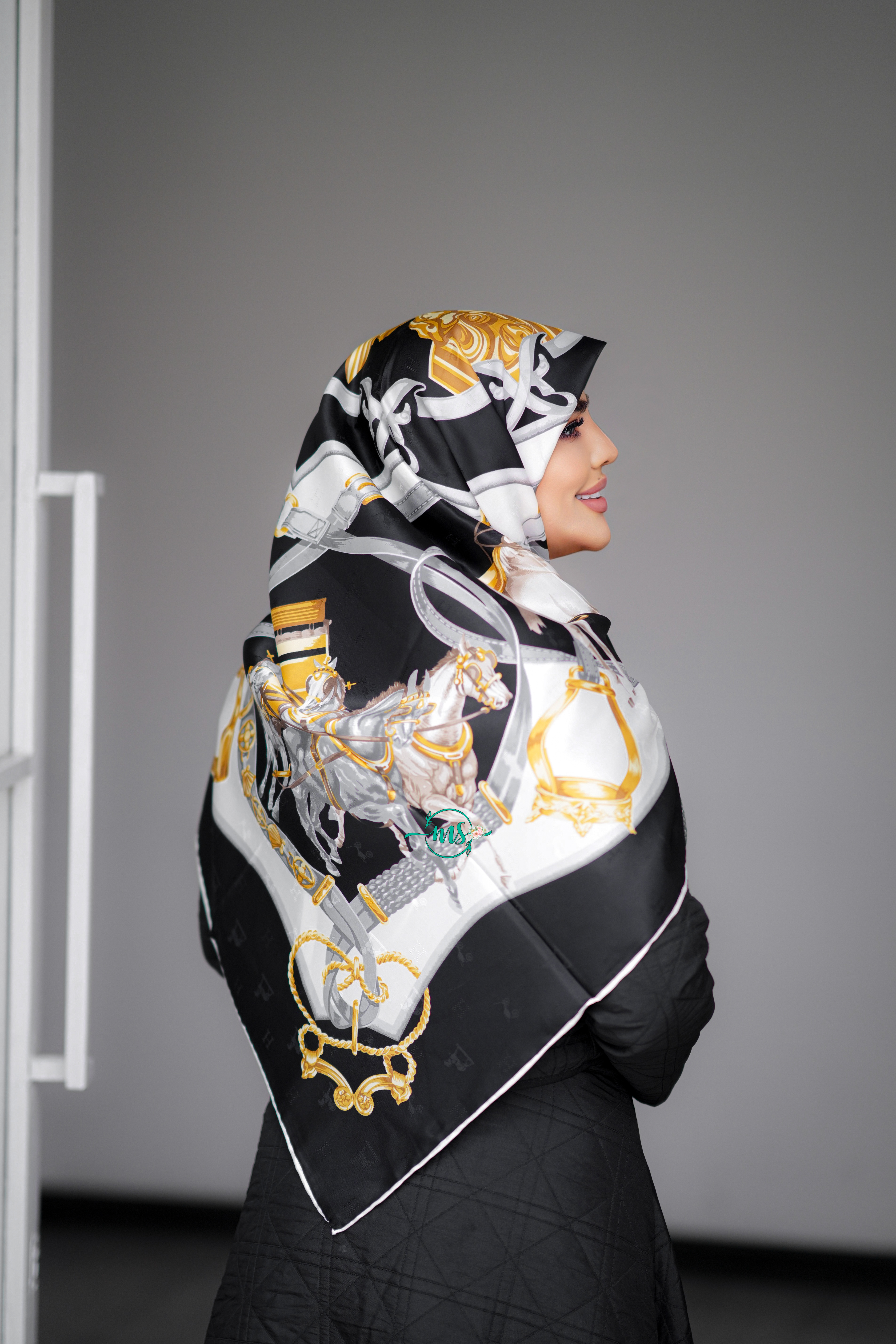 روسری ژاکارد طرح کالسکه و اسب سفید مشکی طوسی
