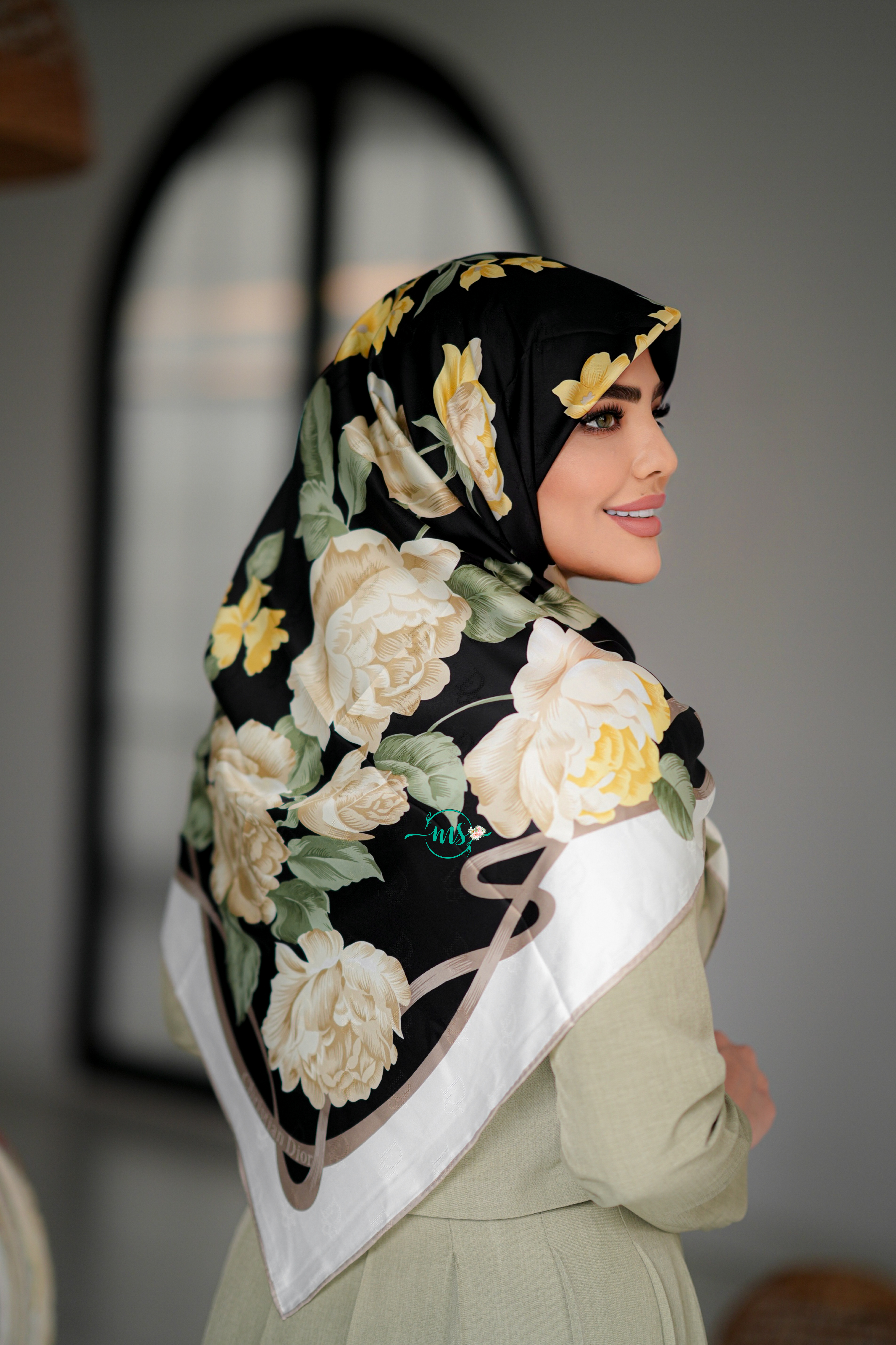 روسری ابریشم ژاکارد طرح گل رز دیوررنگ مشکی کرم طلایی