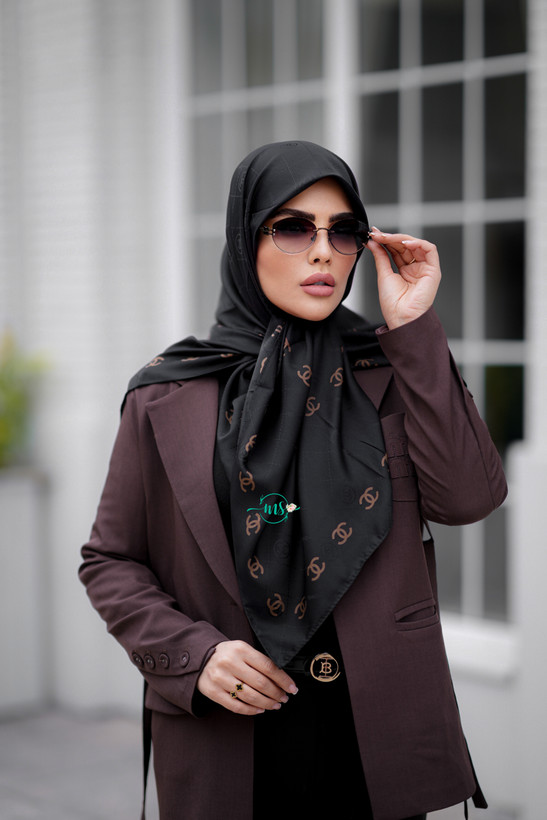 این روسری با طرح الهامگرفته از برند شنل (chanel)، دارای وسط ساده و مینیمال است که با حاشیه طرح برند طلاکوب تزئین شده،