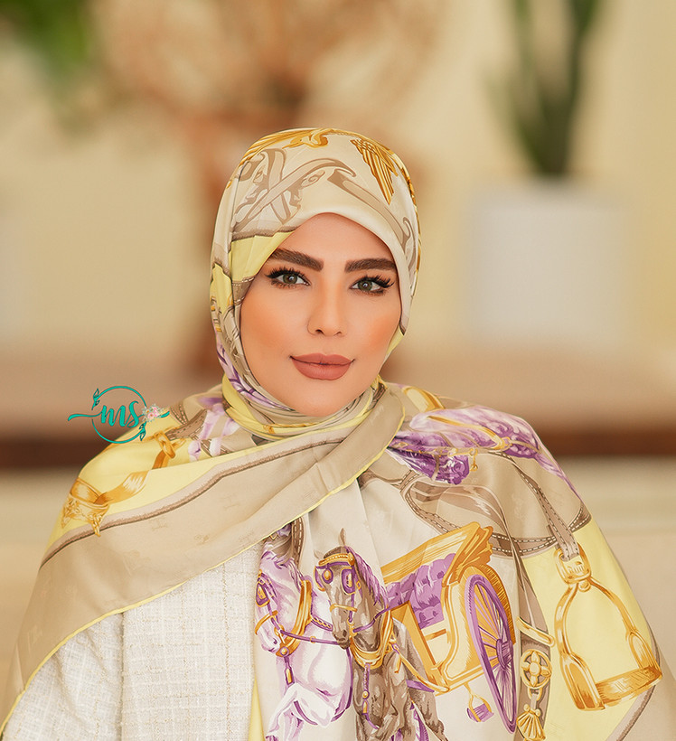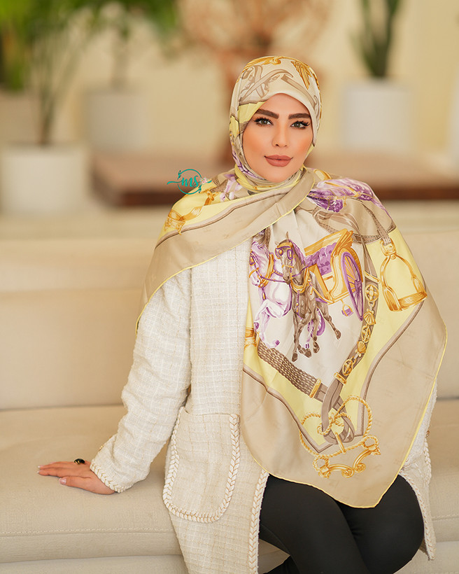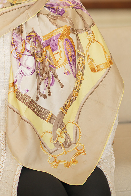 روسری ژاکارد طرح کالسکه و اسب زرد کرم