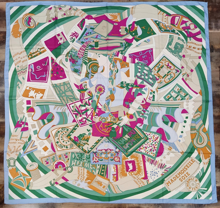 روسری ابریشم کجراه طرح مادمازل رنگ کرم نارنجی