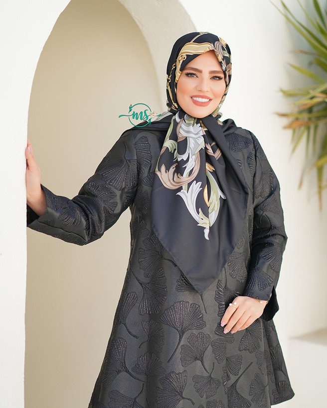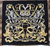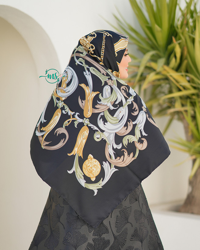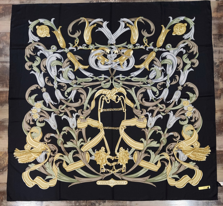 روسری ابریشم کجراه طرح فرفورژه مشکی طلایی