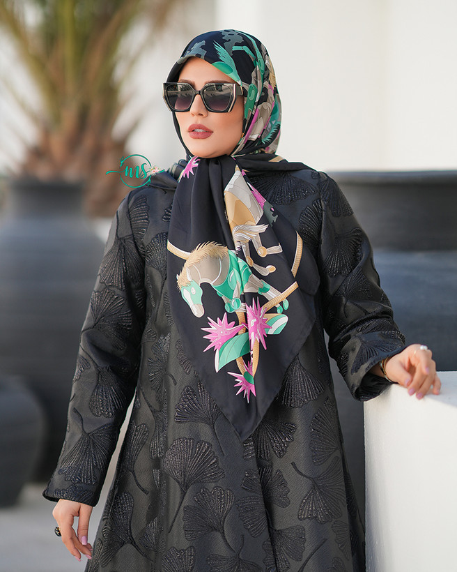 روسری ابریشم کجراه طرح کابوی مشکی طوسی