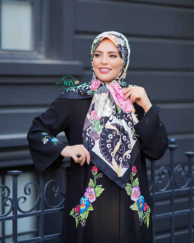 روسری ابریشم کجراه طرح عطر مشکی گلبهی