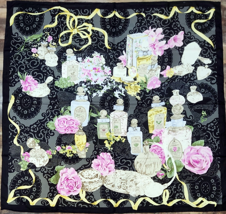 روسری ابریشم کجراه طرح عطر سفید مشکی