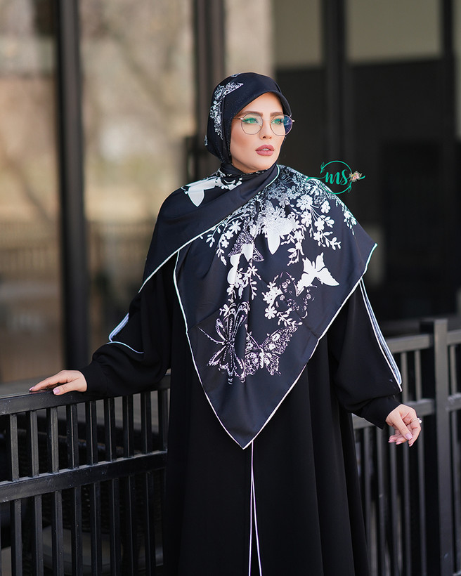 روسری ابریشم کجراه طرح پروانه سفید مشکی
