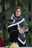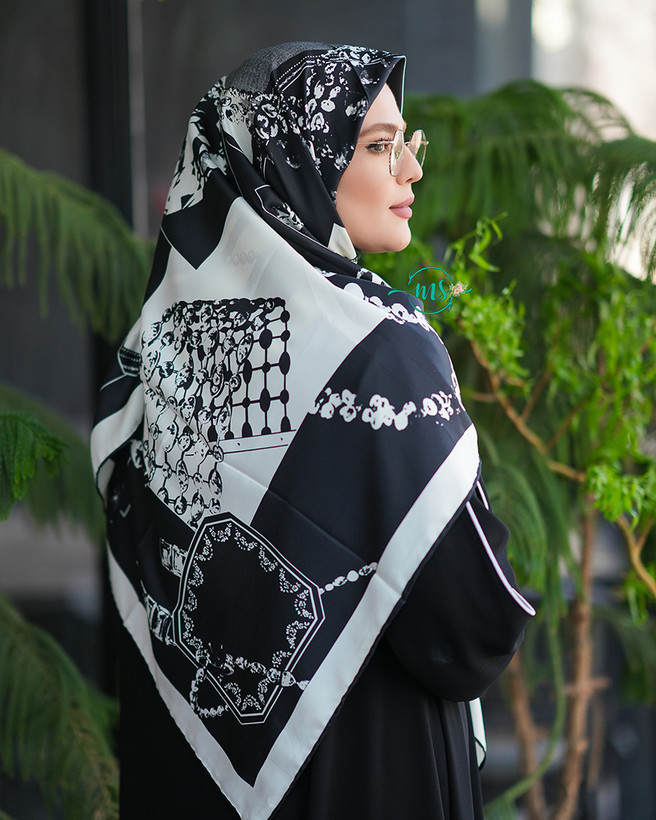 روسری ابریشم کجراه طرح کارتیه سفید مشکی
