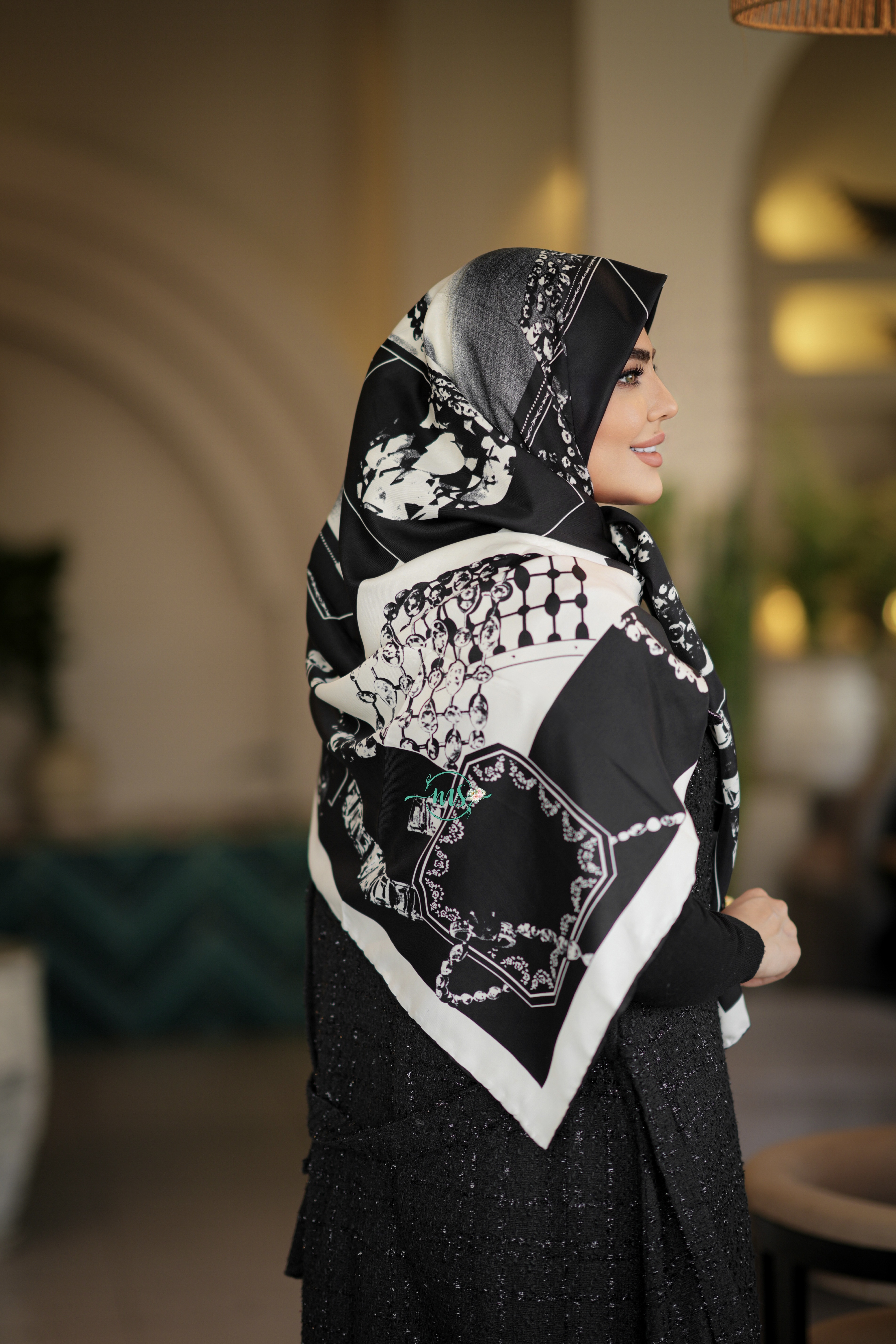 روسری ابریشم کجراه طرح کارتیه سفید مشکی