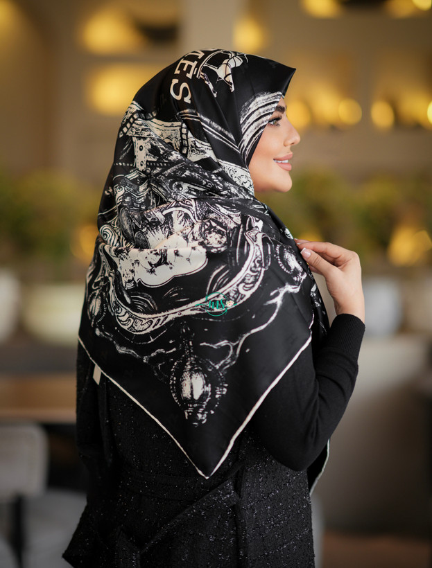 روسری ابریشم ژاکارد طرح لاکچری مشکی سفید