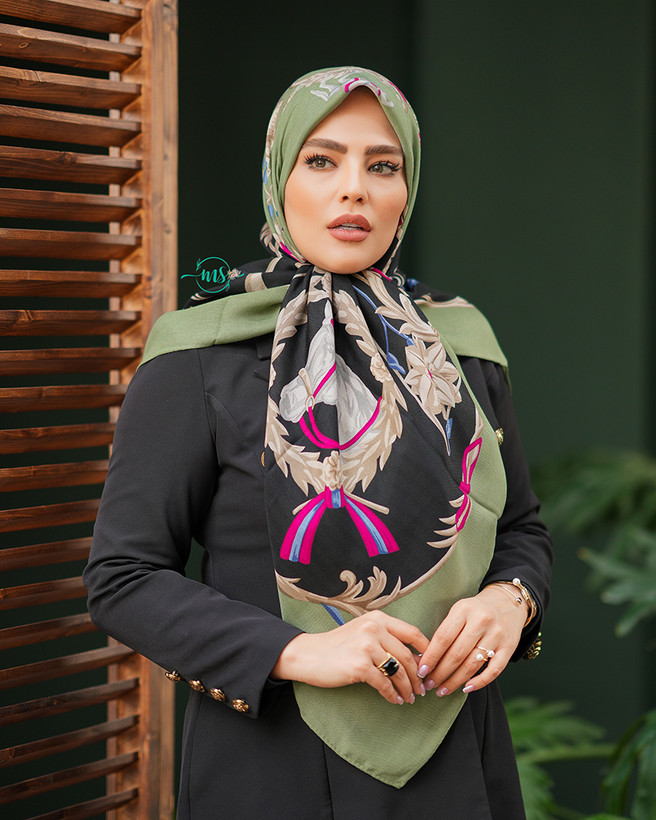 روسری کشمیر طرح گل و اسب مشکی سبز
