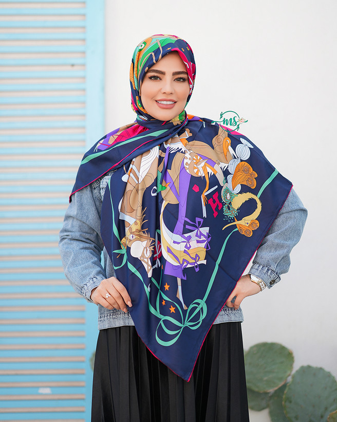 روسری ابریشم کجراه طرح بالماسکه سرمه ای سرخابی