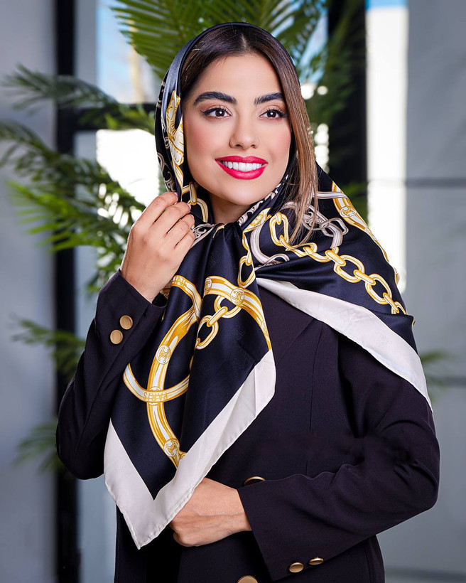 روسری ابریشم ژاکارد طرح کمربندی وسط ساده مشکی کرم