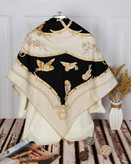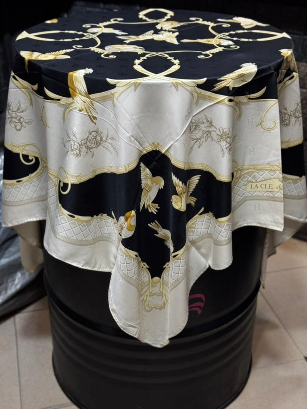 روسری ابریشم ژاکارد طرح گنجشک کرم مشکی طلایی