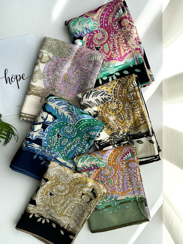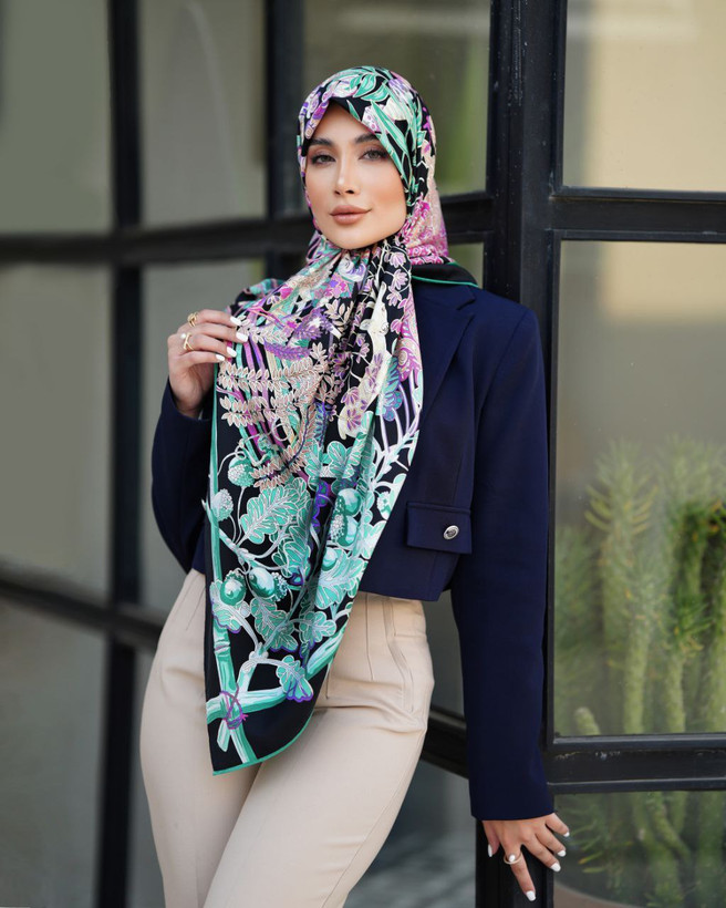 روسری ابریشم ژاکارد طرح جنگل بارانی مشکی سبز