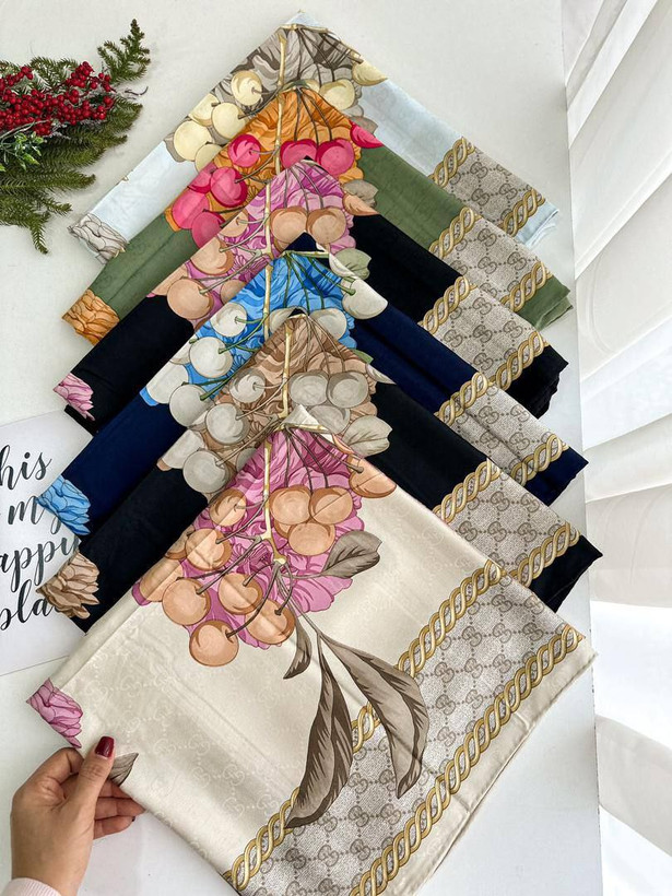 روسری ابریشم ژاکارد طرح گل و گیلاس کرم