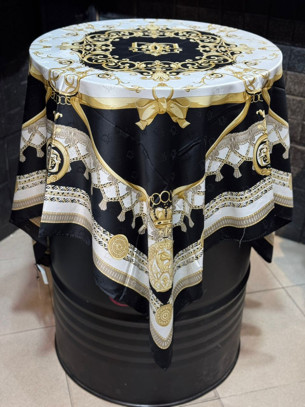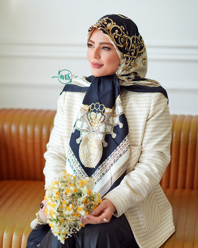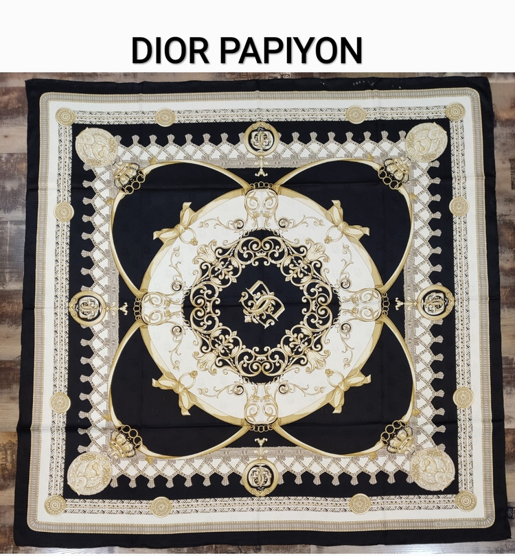 روسری ابریشم ژاکارد طرح دیور پاپیون مشکی طلایی سفید