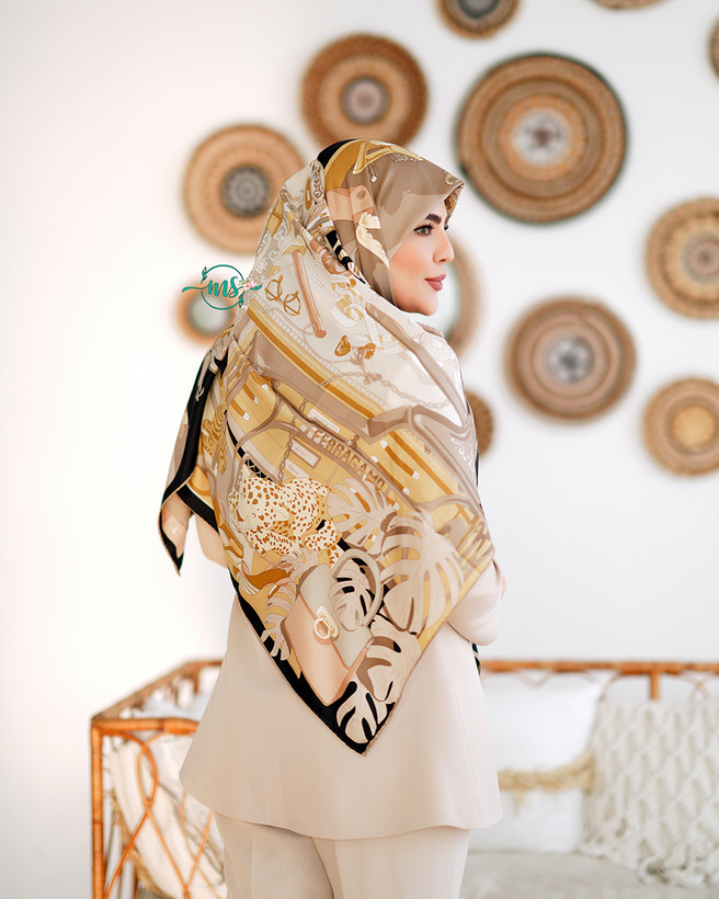 روسری ابریشم ژاکارد طرح نقاشی مشکی کرم