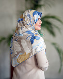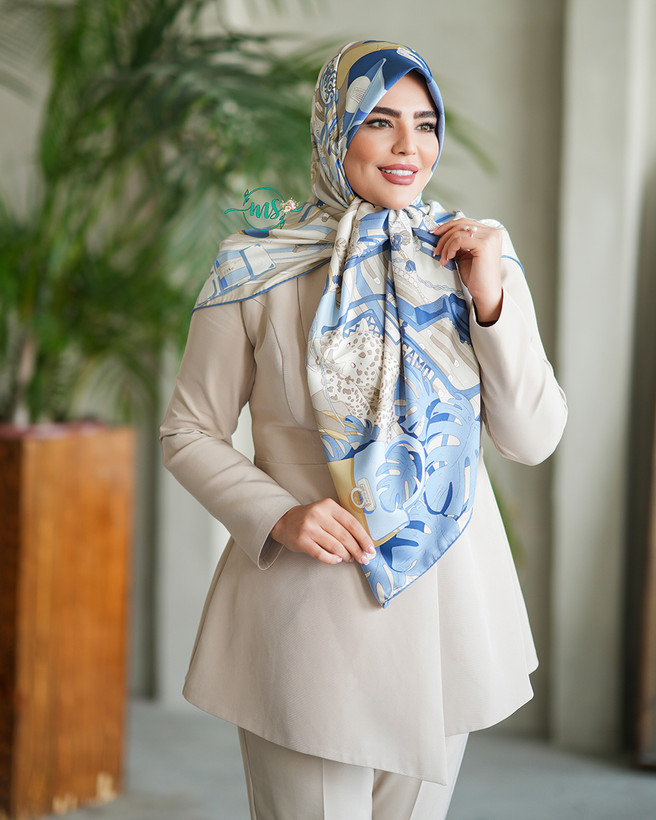 روسری ابریشم ژاکارد طرح نقاشی کرم آبی