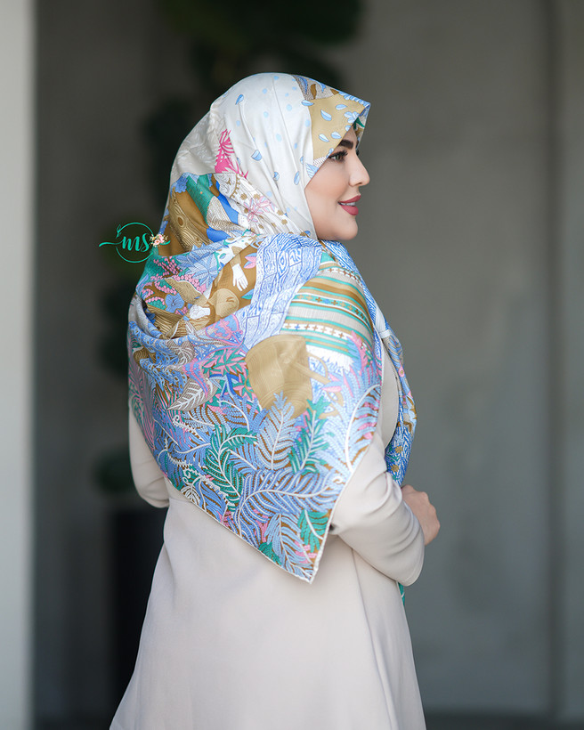 روسری ابریشم ژاکارد طرح هرمس هندسی صورتی آبی