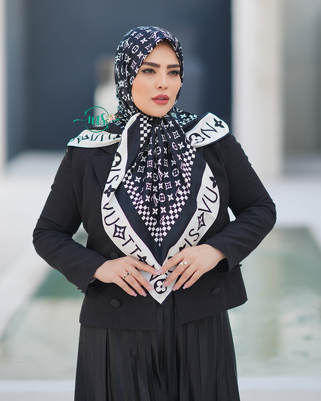 روسری ابریشم ژاکارد طرح ال وی مشکی سفید
