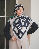 روسری ابریشم ژاکارد طرح شنل کیف مشکی سفید حاشیه کرم