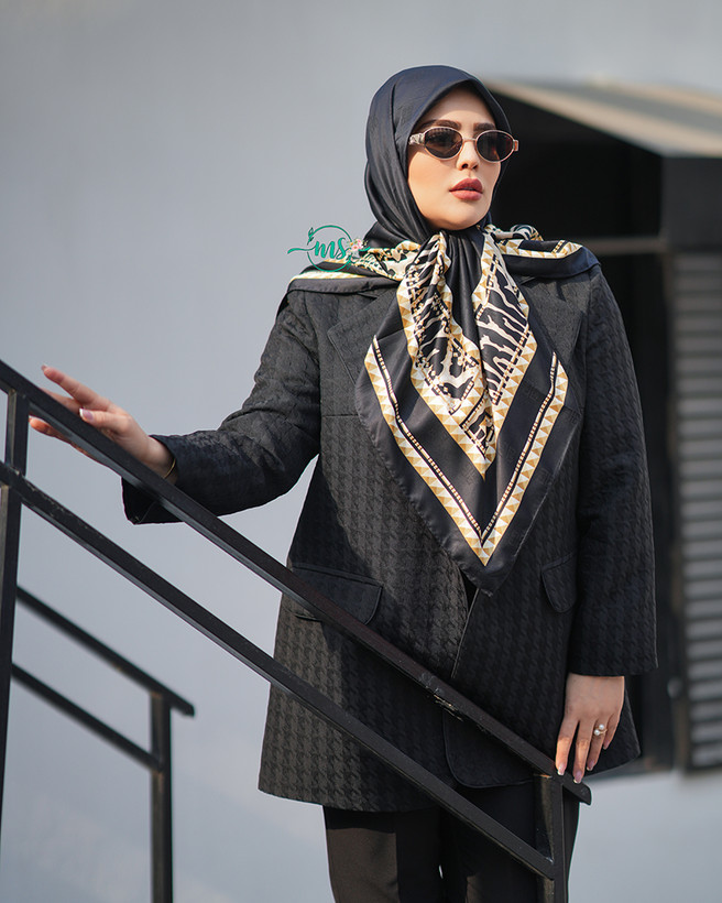 روسری ابریشم ژاکارد طرح حاشیه دار جیوانجی مشکی طلایی