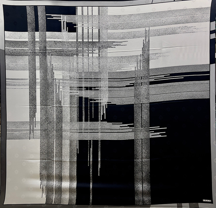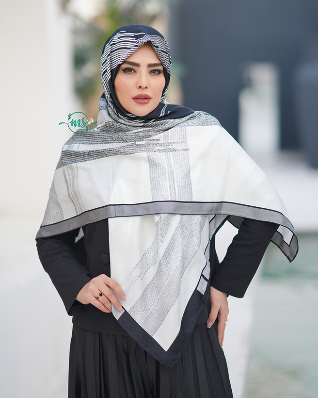 روسری ابریشم ژاکارد اکر طرح خطی رنگ مشکی طوسی