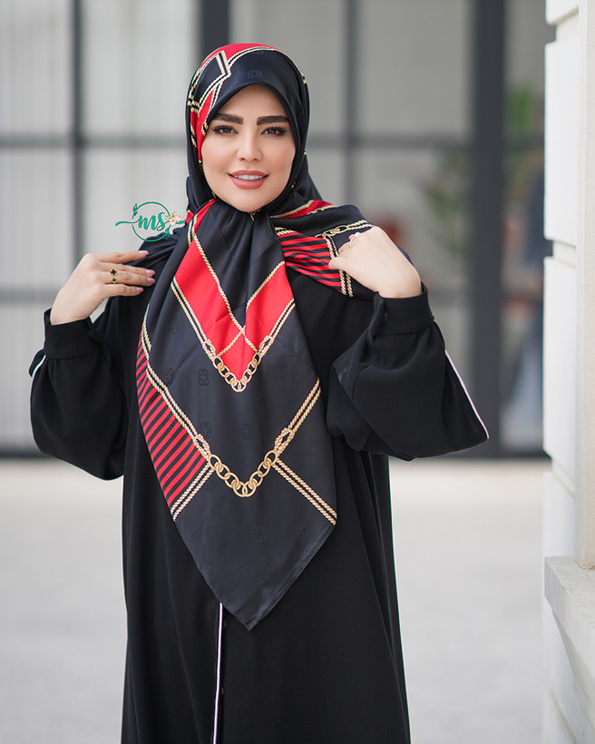 روسری ابریشم ژاکارد طرح کمربندی مشکی قرمز
