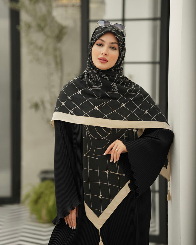 روسری سیا اسکارف منگوله دار طرح شنل رنگ مشکی کرم