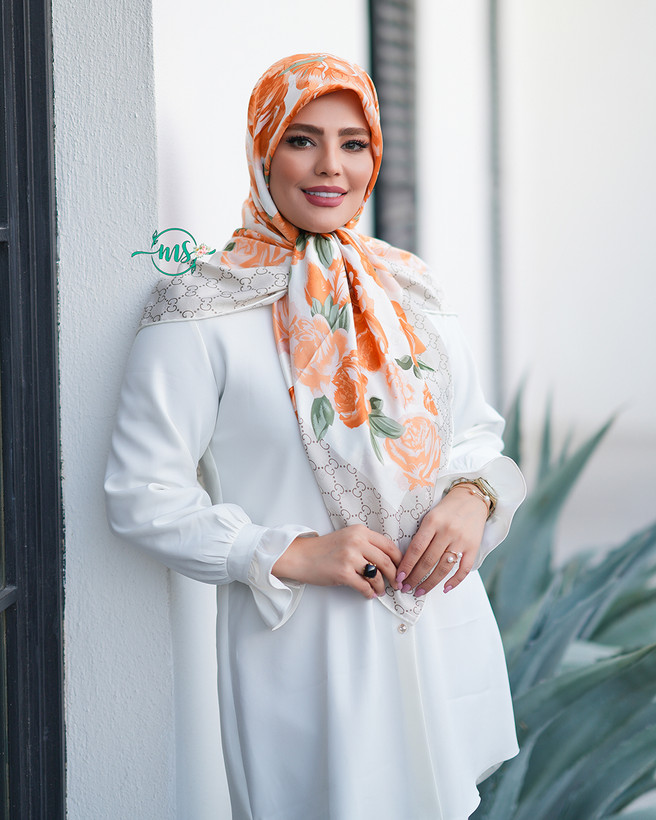 روسری ابریشم ژاکارد طرح گل نارنجی