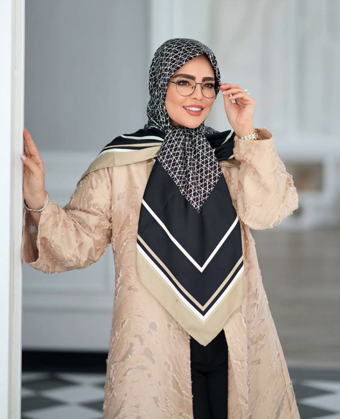 روسری ابریشم ژاکارد طرح مثلثی مشکی کرم