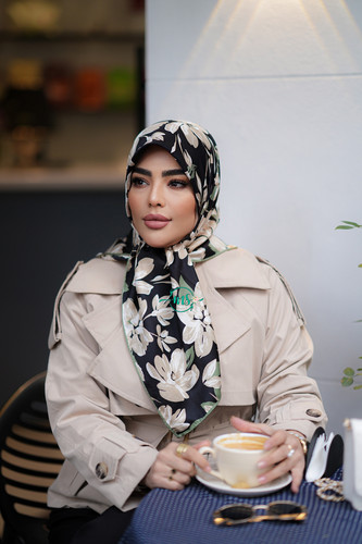 روسری ابریشم ژاکارد طرح گل رنگ مشکی کرم حاشیه کرم